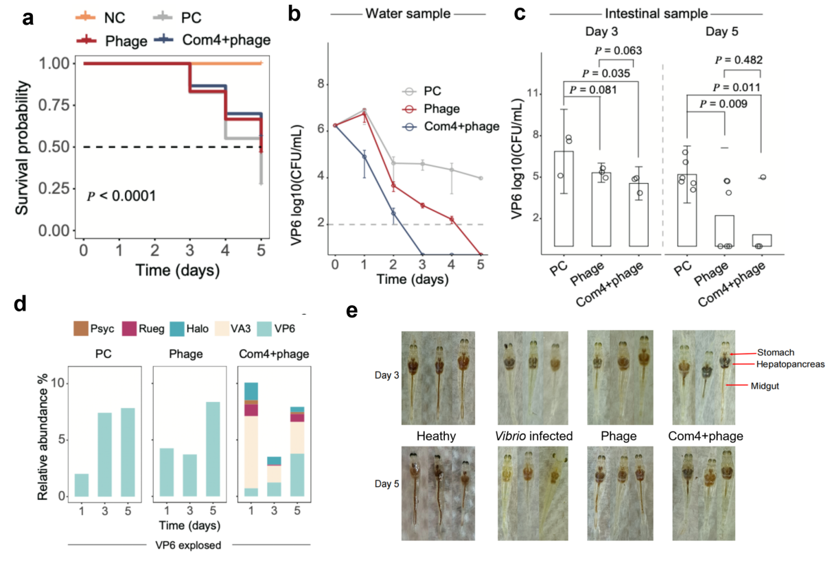 图6. 噬菌体与共生菌 Com4 对南美白对虾致病弧菌(VP6)的防控效果