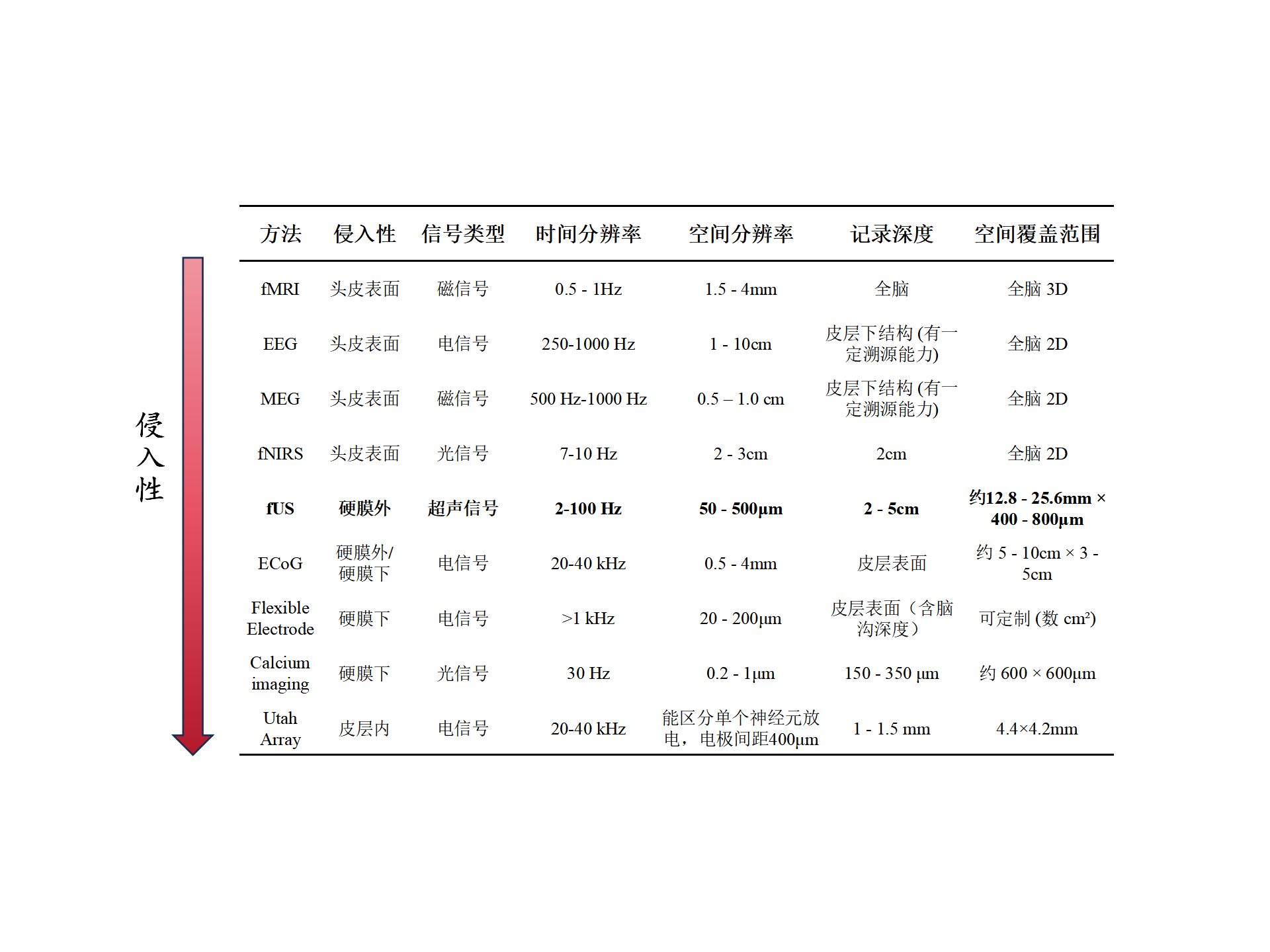 图1 主流神经信号采集技术在时空分辨率、侵入性及覆盖范围上的对比