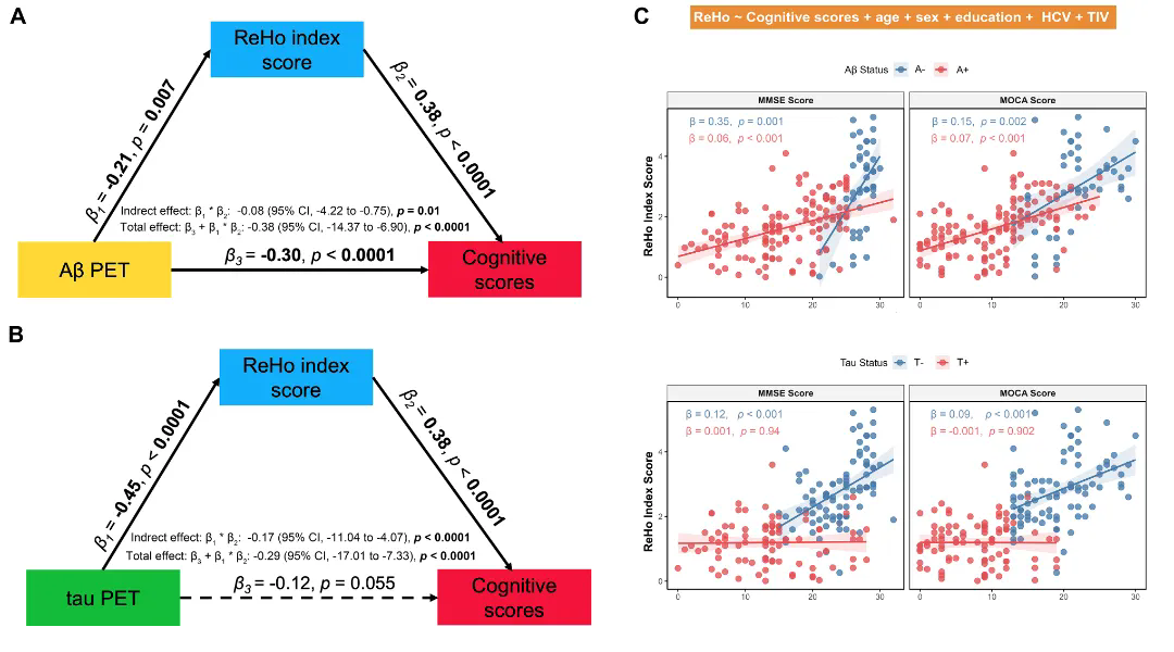 图3: AD病理、脑功能改变与临床认知评分之间的中介分析结果(A, B)及脑功能活动与临床认知评分之间的关联(C)