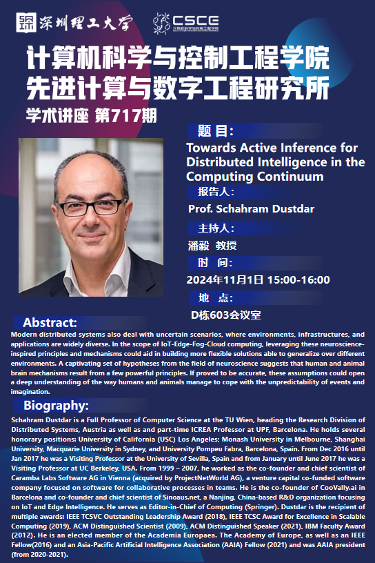 大家好!数字所/计算机学院717学术讲座将于11月1日15:00-16:00在D603会议室举行,本次讲座将邀奥地利维也纳工业大学 Schahram Dustdar 教授作题为“Towards Active Inference for Distributed Intelligence in the Computing Continuum的报告。本次报告将由计算机学院 潘毅 教授主持,诚挚邀请大家参加、学习和研讨!