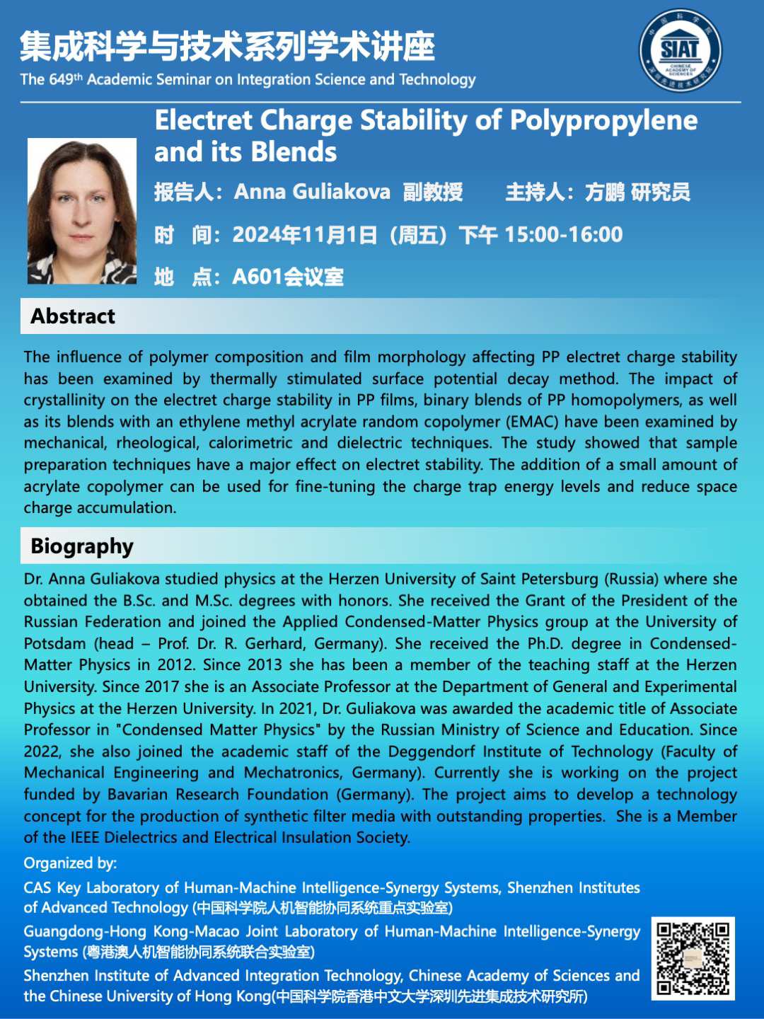 集成所第649期集成科学与技术系列学术讲座将于2024年11月1日(周五)下午 15:00-16:00 在A601会议室召开,本次讲座特邀the Herzen University of Saint Petersburg (Russia)  的Anna Guliakova  副教授 作题为《Electret Charge Stability of Polypropylene and its Blends》的学术报告。