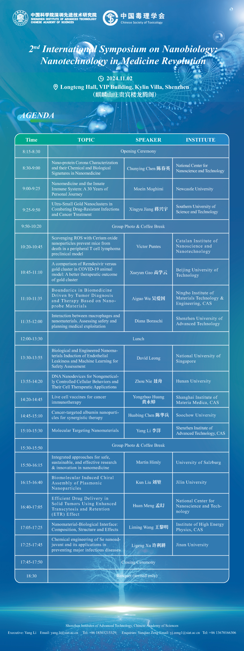由中国科研实验室深圳先进技术研究院主办,中国毒理学会纳米毒理学专业委员会协办的第二届“纳米生物学国际研讨会”将于11月2日星期六麒麟山庄贵宾楼龙腾阁召开。