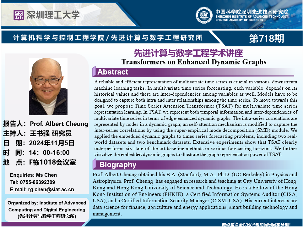 大家好!数字所/计算机学院718学术讲座将于11月5日14:00-16:00在F1018会议室举行,本次讲座将邀请香港科技大学 Albert Cheung 教授作题为“Transformers on Enhanced Dynamic Graphs的报告。本次报告将由数字所 王书强 研究员主持,诚挚邀请大家参加、学习和研讨!