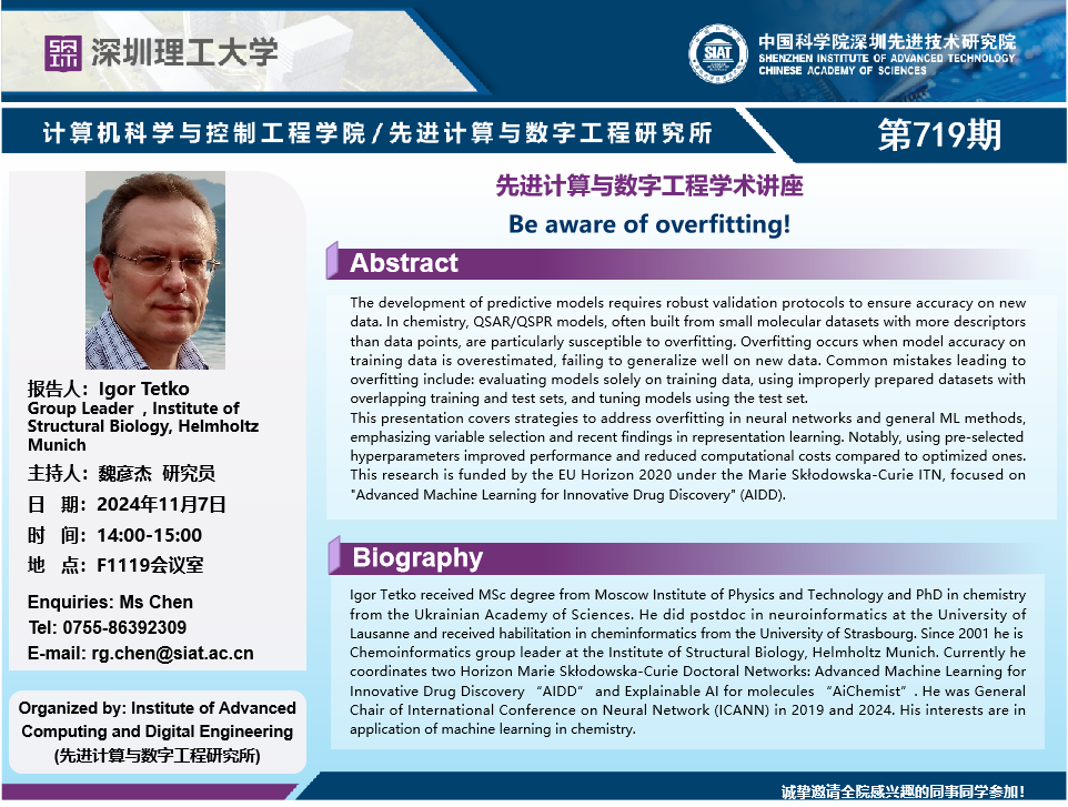 大家好!数字所/计算机学院第719期学术讲座将于11月7日14:00-15:00在F1119会议室举行,本次讲座将邀请慕尼黑亥姆霍兹中心(Helmholtz Munich) Igor Tetko 教授作题为“Be aware of overfitting的报告。本次报告将由数字所 魏彦杰 研究员主持,诚挚邀请大家参加、学习和研讨!