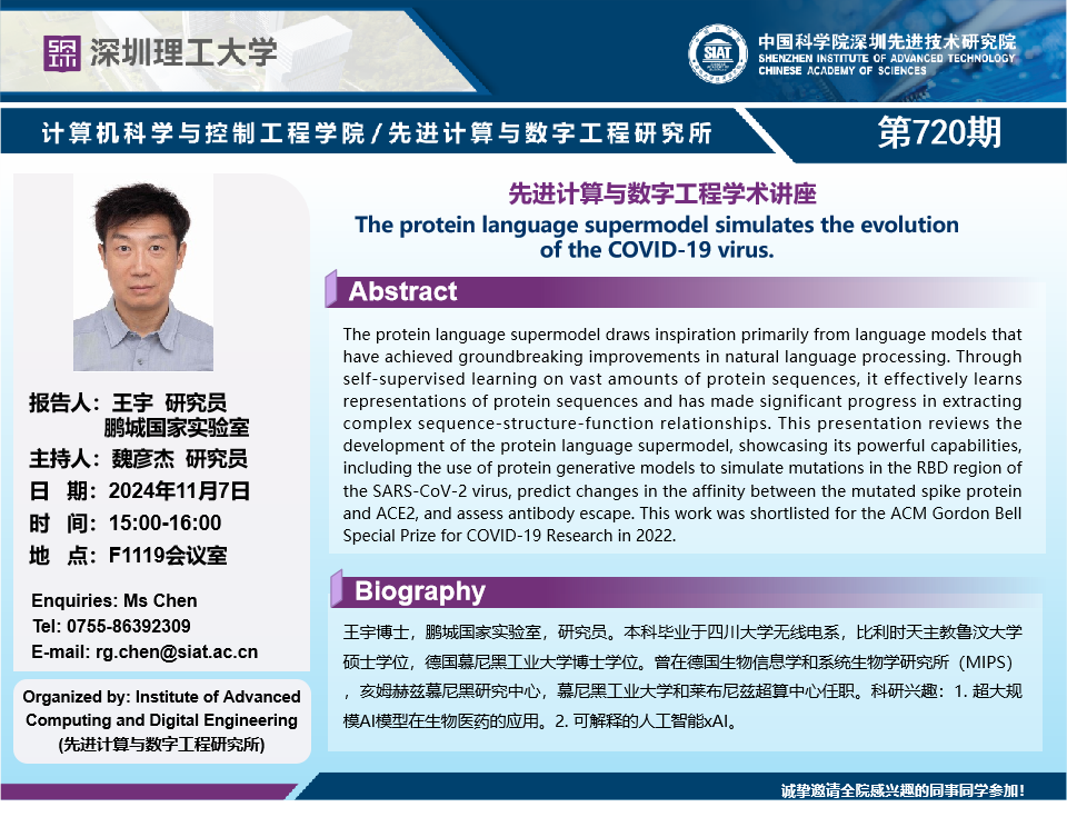 大家好!数字所/计算机学院720学术讲座将于11月7日15:00-16:00在F1119会议室举行,本次讲座将邀请鹏城国家实验室 王宇 研究员作题为“The protein language supermodel simulates the evolution of the COVID-19 virus的报告。本次报告将由数字所 魏彦杰 研究员主持,诚挚邀请大家参加、学习和研讨!