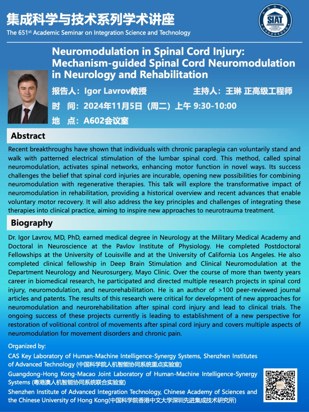 集成所第651期集成科学与技术系列学术讲座将于2024年11月5日(周二)上午 9:30-10:00 在A602会议室召开,本次讲座特邀 Mayo Clinic 的 Igor Lavrov教授 作题为《Neuromodulation in Spinal Cord Injury: Mechanism-guided Spinal Cord Neuromodulation in Neurology and Rehabilitation》的学术报告。