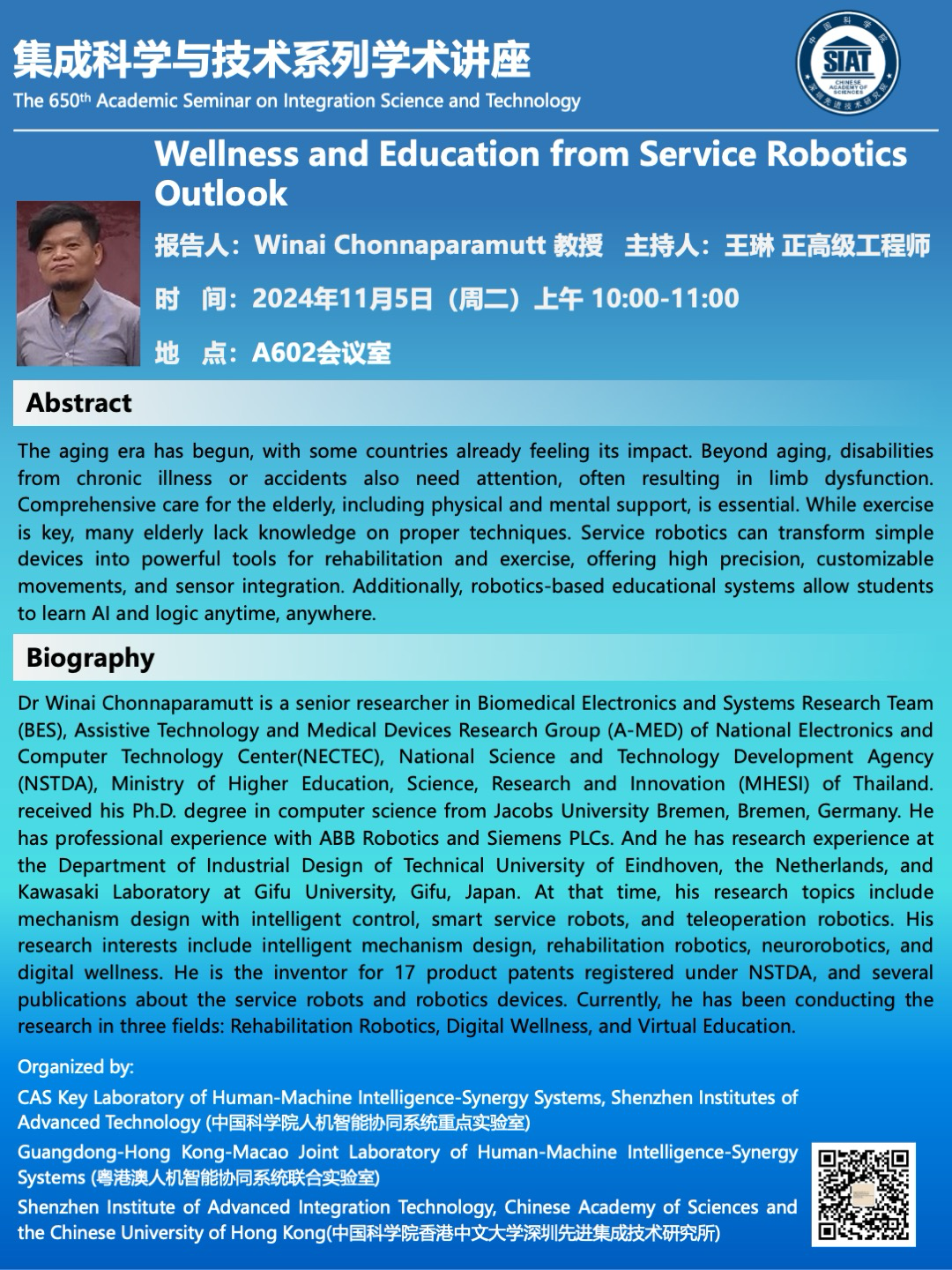 集成所第650期集成科学与技术系列学术讲座将于2024年11月5日(周二)上午 10:00-11:00 在A602会议室召开,本次讲座特邀 National Electronics and Computer Technology Center(Thailand) 的Winai Chonnaparamutt 教授 作题为《Wellness and Education from Service Robotics Outlook》的学术报告。