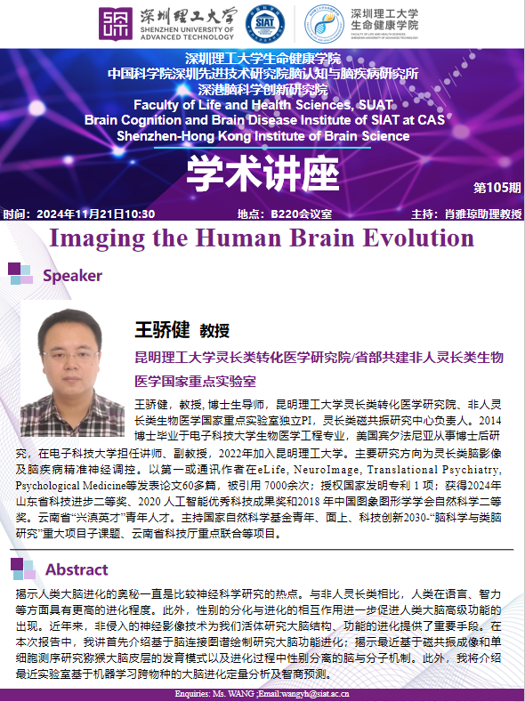 昆明理工大学灵长类转化医学研究院/省部共建非人灵长类生物医学国家重点实验室,王骄健教授,带来题为“Imaging the Human Brain Evolution专题讲座。