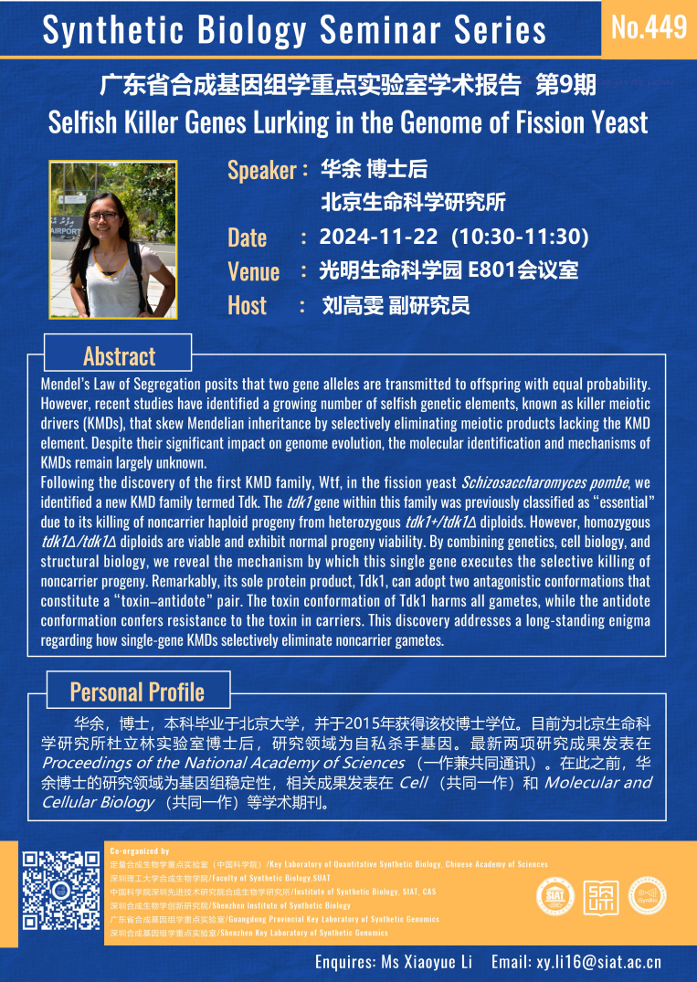 合成所/合成生物学院第449期学术讲座将于 11月22日(星期五)10:30-11:30 在 光明科学生命园 E801会议室举行。