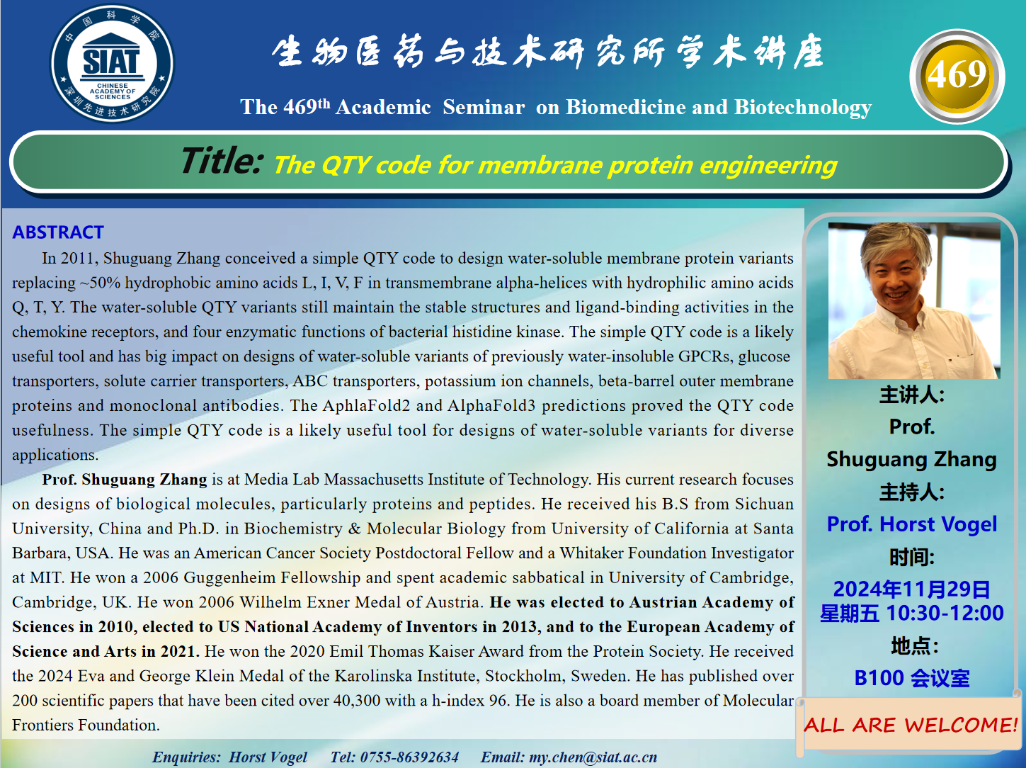 大家好! 医药所第469期学术讲座将于2024年11月29日 星期五 10:30-12:00  B100会议室举行。本次讲座邀请了来自麻省理工学院 Zhang Shuguang  教授带来“The QTY code for membrane protein engineering的报告。届时, Horst Vogel 教授将主持讲座。