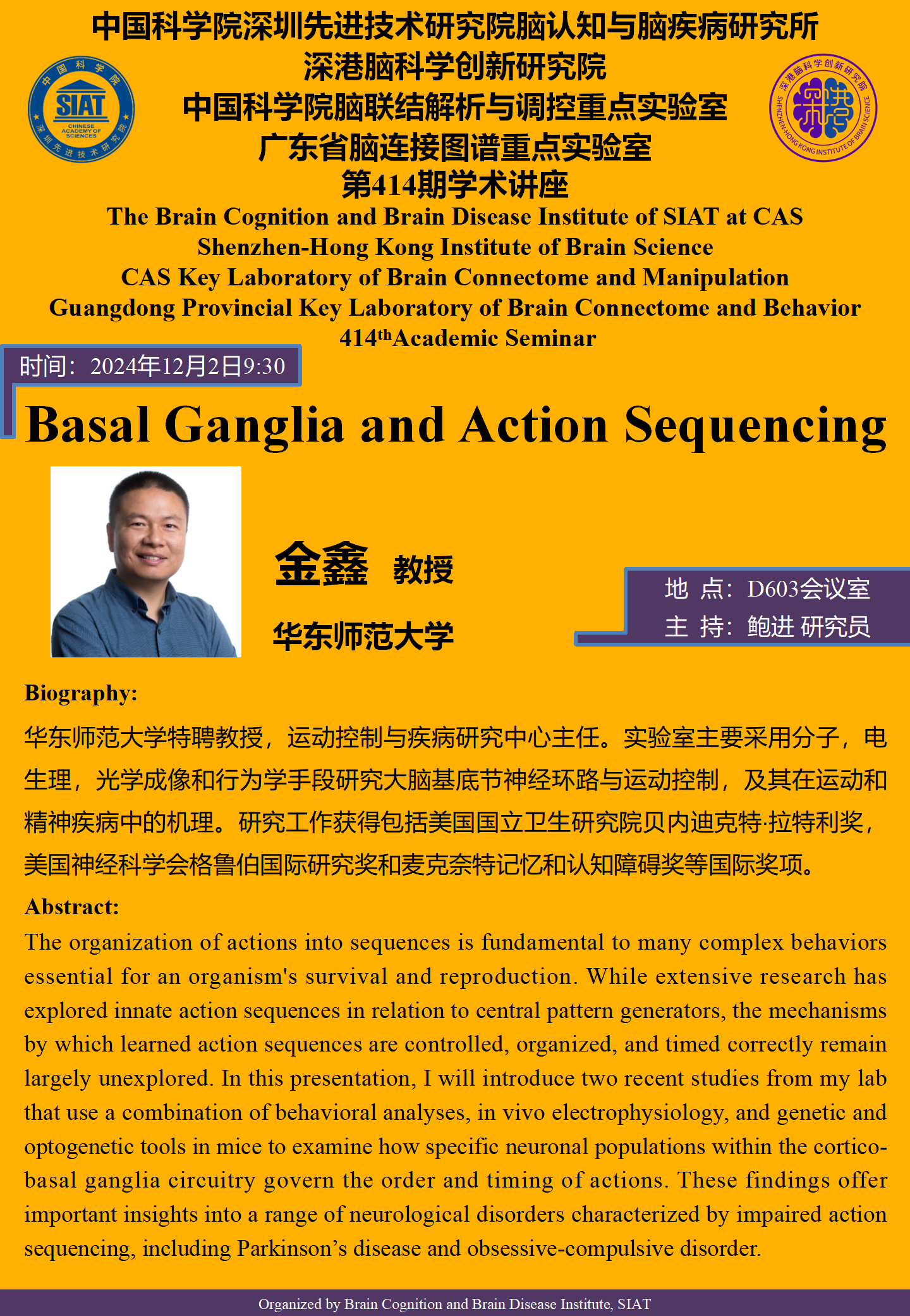 脑所/深港脑院将于12月2日(星期一) 9:30,地点:先进院(西丽)D603 会议室 举办第414期学术讲座。本次讲座邀请到华东师范大学,金鑫教授,带来题为“Basal Ganglia and Action Sequencing”的报告