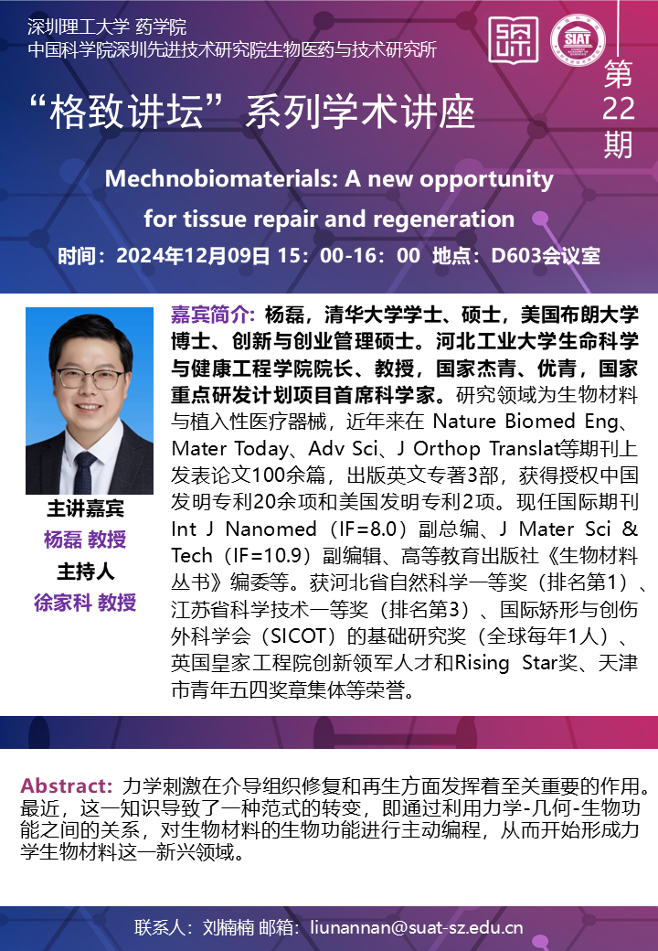 大家好!药学院/医药所“格致讲坛”系列学术讲座第22期将于20241209日(周一)15:00,在先进院D603会议室举行。本次讲座邀请了来自河北工业大学的杨磊教授带来“Mechnobiomaterials: A new opportunity for tissue repair and regeneration的报告。届时,徐家科教授将主持讲座。