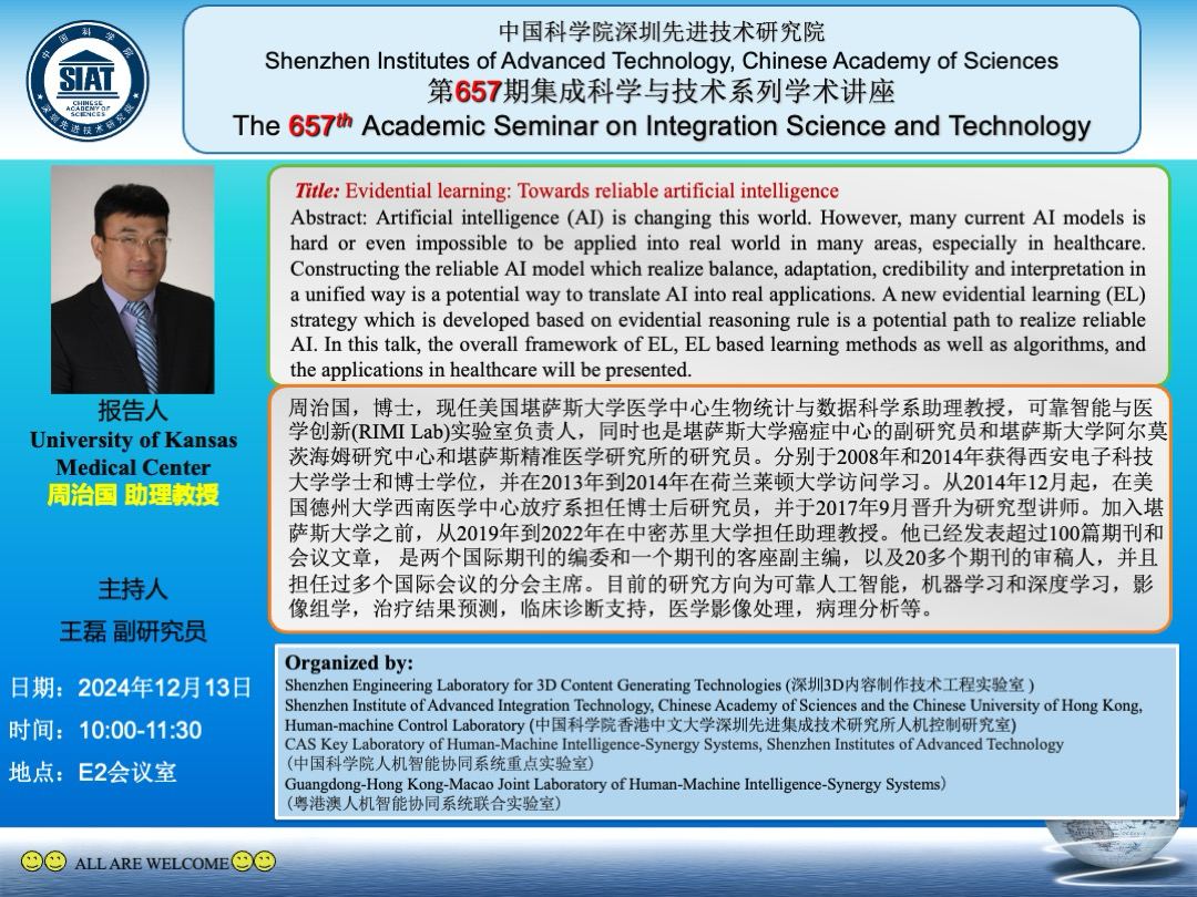 集成所第657期集成科学与技术系列学术讲座将于2024年12月13日(周五)10:00-11:30在 E2会议室 召开,次讲座特邀美国堪萨斯大学周治国 助理教授作题为《Evidential learning: Towards reliable artificial intelligence的学术报告。