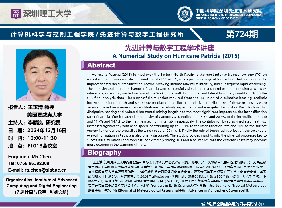 大家好!数字所/计算机学院第724期学术讲座将于12月16日10:00-11:30在F1018会议室举行,本次讲座将邀请美国夏威夷大学 王玉清 教授作题为“A Numerical Study on Hurricane Patricia (2015)”的报告。