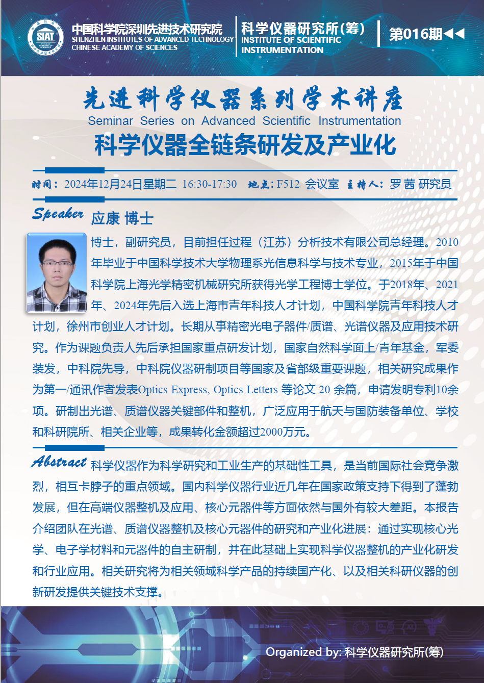 科学仪器研究所(集群)第016期 先进科学仪器系列学术讲座将于2024年12月24日(星期二)下午16:30-17:30举行,讲座地点:F512会议室。