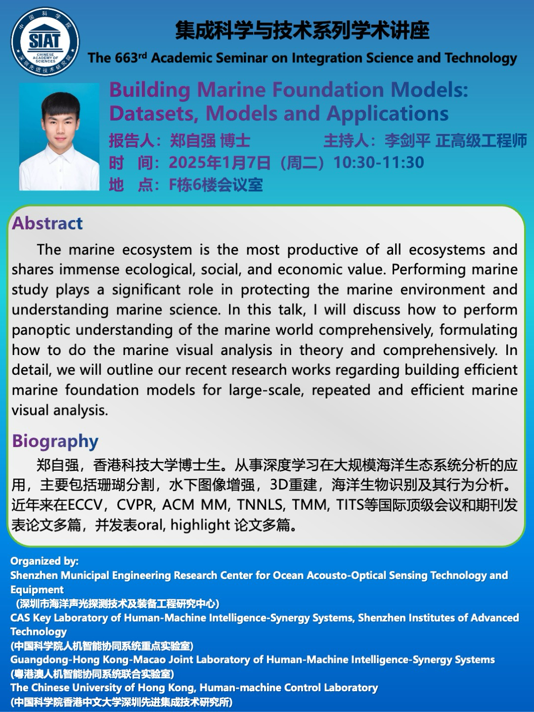 集成所第663期集成科学与技术系列学术讲座将于 2025年1月7日(周二)10:30-11:30 F栋6楼会议室召开,次讲座特邀香港科技大学郑自强博士作题为《Building Marine Foundation Models: Datasets, Models and Applications的学术报告。