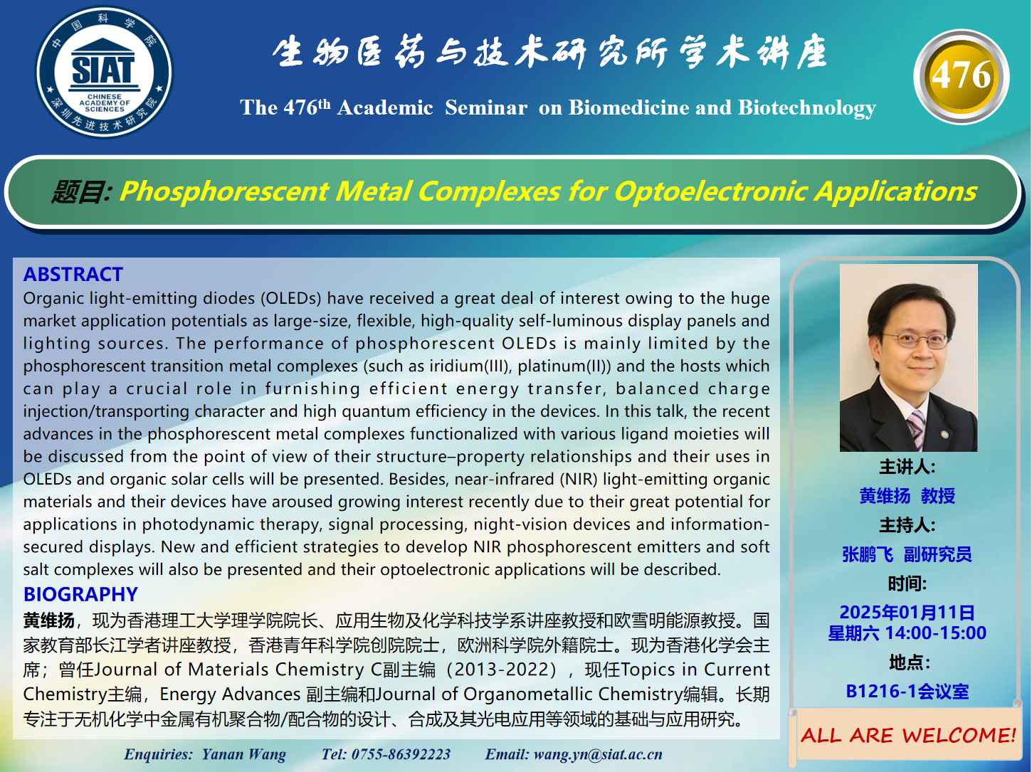 大家好! 医药所第476期学术讲座将于2025年1月11日 星期六 14:00-15:00 B1216-1会议室举行。本次讲座邀请了来自香港理工大学 黄维扬  教授带来“Phosphorescent Metal Complexes for Optoelectronic Applications的报告。届时,张鹏飞 副研究员将主持讲座。
