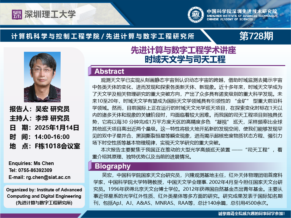 大家好!数字所/计算机学院728学术讲座将于1月14日14:00-16:00在F1018会议室举行,本次讲座将邀请中国科研实验室国家天文台 吴宏 研究员作题为“时域天文学与司天工程的报告。