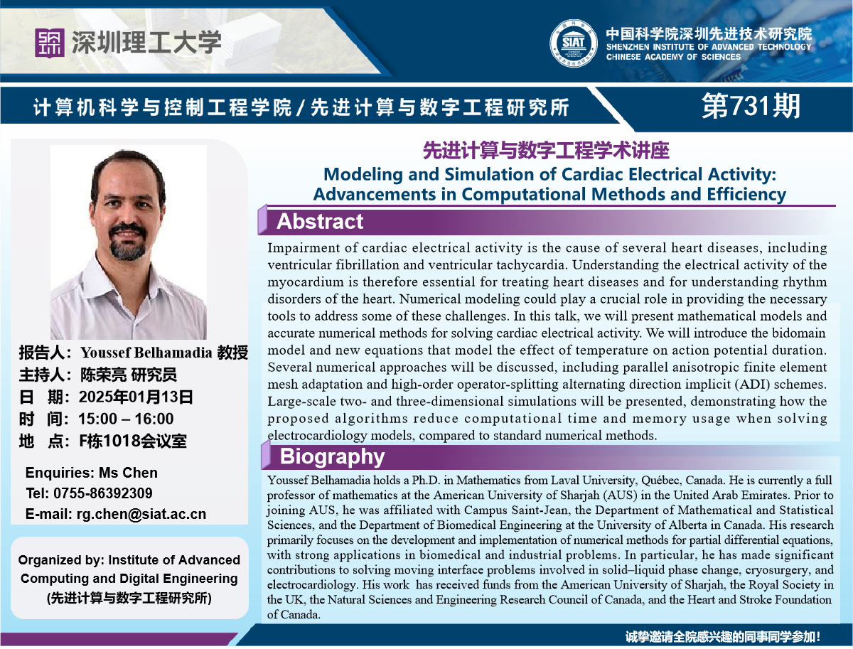 数字所/计算机学院731学术讲座将于1月13日15:00-16:00在F1018会议室举行,本次讲座将邀请阿联酋沙迦美国大学 Youssef Belhamadia 教授作题为“Modeling and Simulation of Cardiac Electrical Activity: Advancements in Computational Methods and Efficiency的报告。本次报告将由数字所 陈荣亮 研究员主持,诚挚邀请大家参加、学习和研讨!