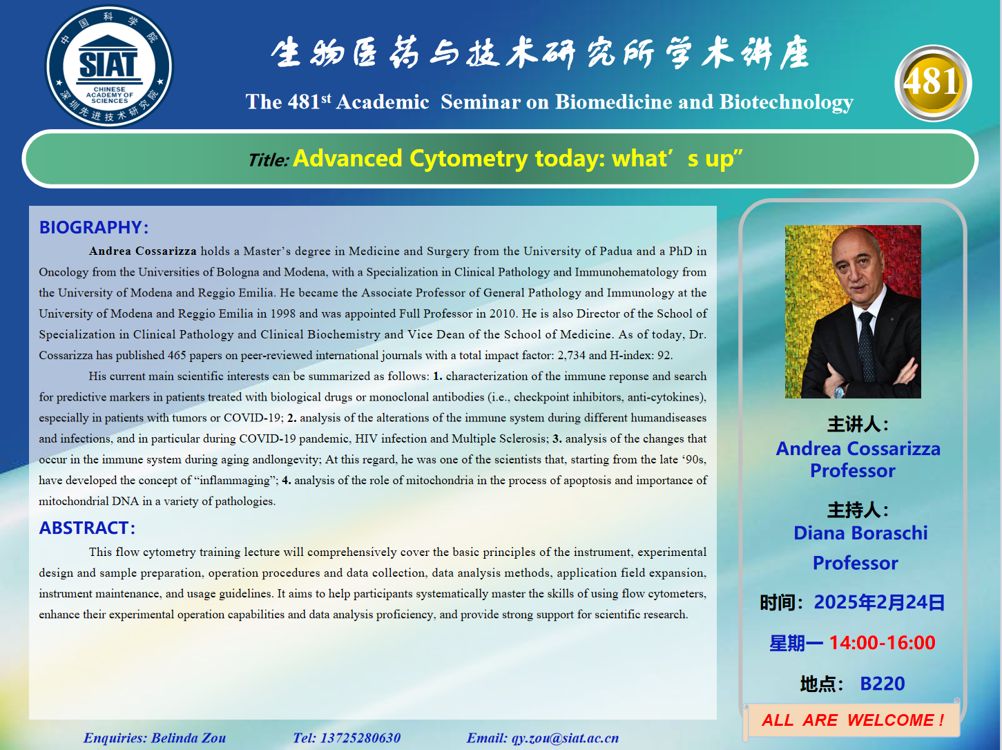 大家好! 医药所第481期学术讲座将于2025年2月24日 星期一 14:00-16:00 B220会议室举行。本次讲座邀请了来自摩德纳-雷焦·艾米利亚大学 Andrea Cossarizza 教授带来“Advanced Cytometry today: what’s up”的报告。届时,Diana Boraschi  研究员将主持讲座。