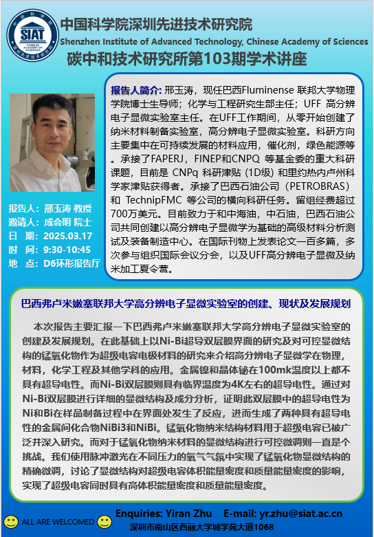 碳中和技术研究所第103期学术讲座将于3月17日(周一)9:30-10:45D6环形报告厅召开。本次讲座特邀巴西Fluminense 联邦大学物理学院 博士生导师;化学与工程研究生部 主任;UFF 高分辨电子显微实验室 主任 邢玉涛 教授 作题为《巴西弗卢米嫩塞联邦大学高分辨电子显微实验室的创建、现状及开展规划》的学术报告。诚挚邀请大家准时参加、学习和研讨!