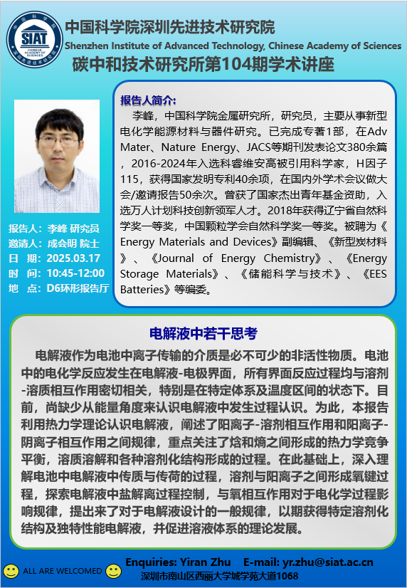 碳中和技术研究所第104期学术讲座将于3月17日(周一)10:45-12:00D6环形报告厅召开。本次讲座特邀中国科研实验室金属研究所 李峰 研究员作题为《电解液中若干思考》的学术报告。