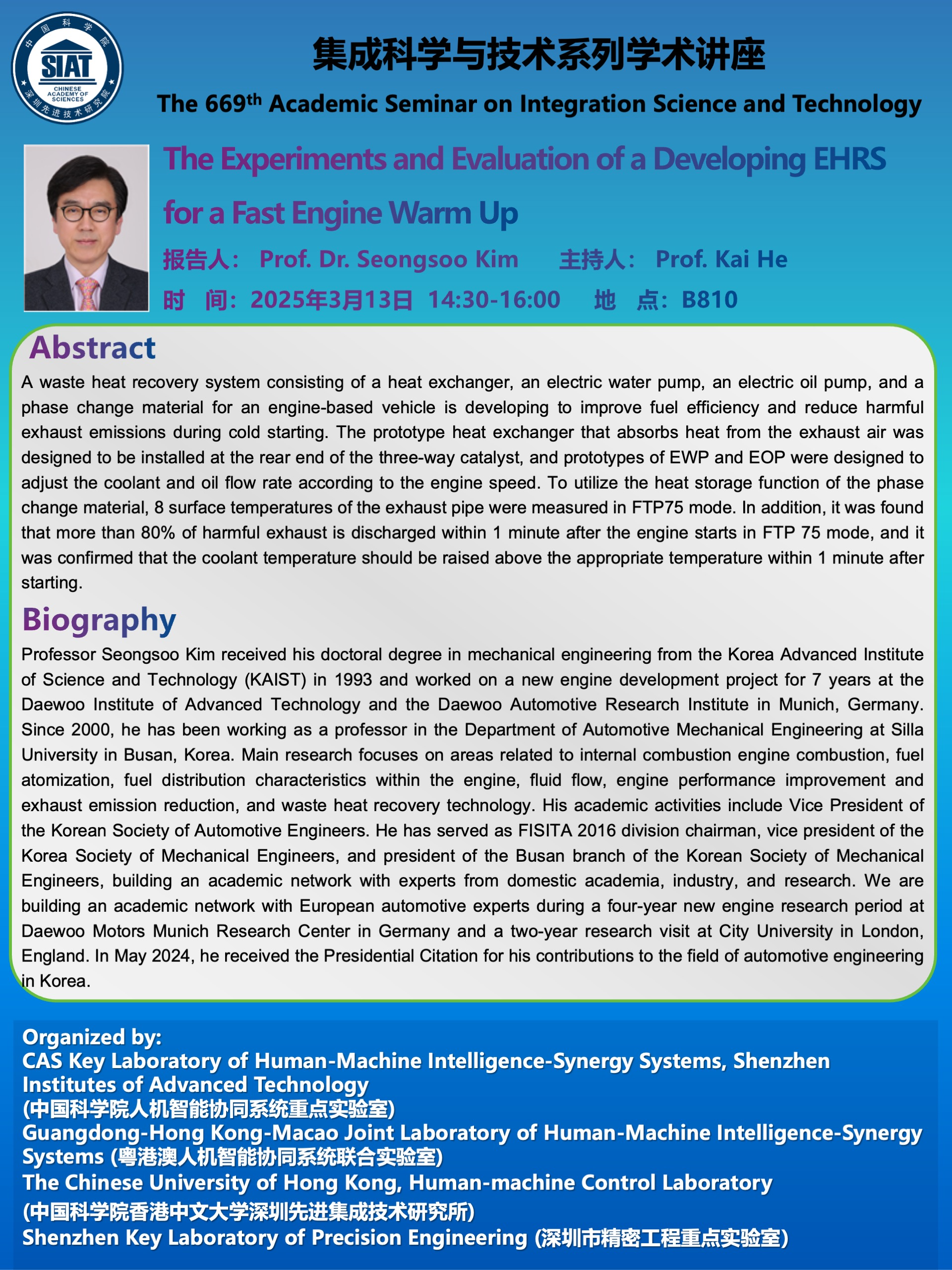 集成所 第669 期 集成科学与技术系列学术讲座将于 2025年3月13日(周四)14:30-16:00 在 B810会议室 召开,次讲座特邀 韩国新罗大学  的 Seongsoo Kim教授作题为《The Experiments and Evaluation of a Developing EHRS for a Fast Engine Warm Up的学术报告。