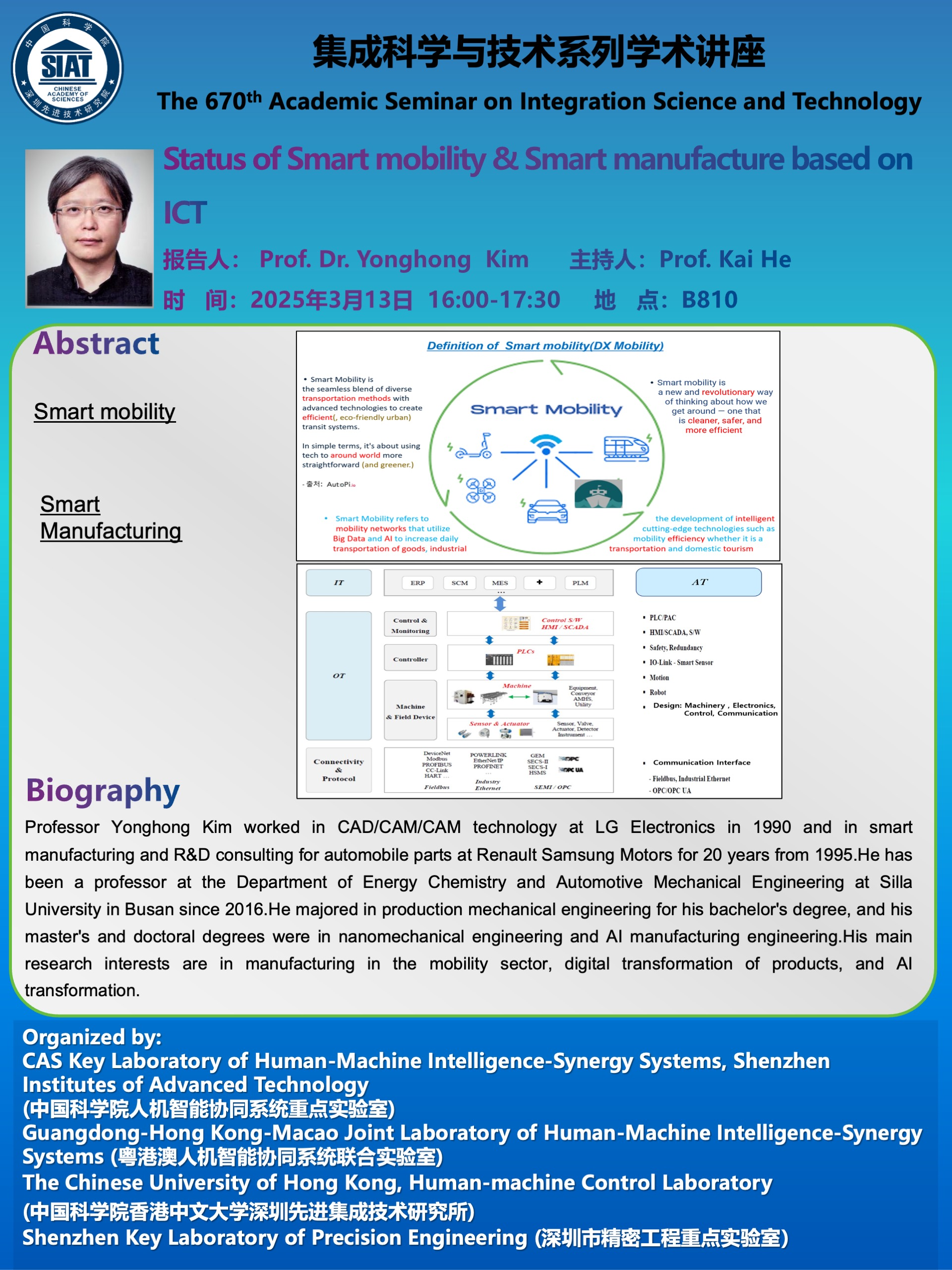 集成所 第670 期 集成科学与技术系列学术讲座将于 2025年3月13日(周四)16:00-17:30 在 B810会议室 召开,次讲座特邀 韩国新罗大学  的 Yonghong Kim 教授作题为《Status of Smart mobility & Smart manufacture based on ICT的学术报告。