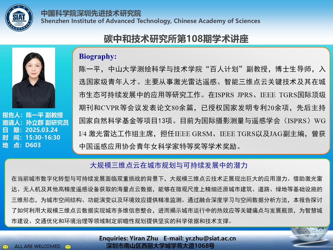 碳中和技术研究所第108期学术讲座将于3月24日(周一)15:30-16:30D603会议室召开。本次讲座特邀中山大学测绘科学与技术学院“百人计划”副教授 陈一平 作题为《大规模三维点云在城市规划与可持续开展中的潜力》的学术报告。