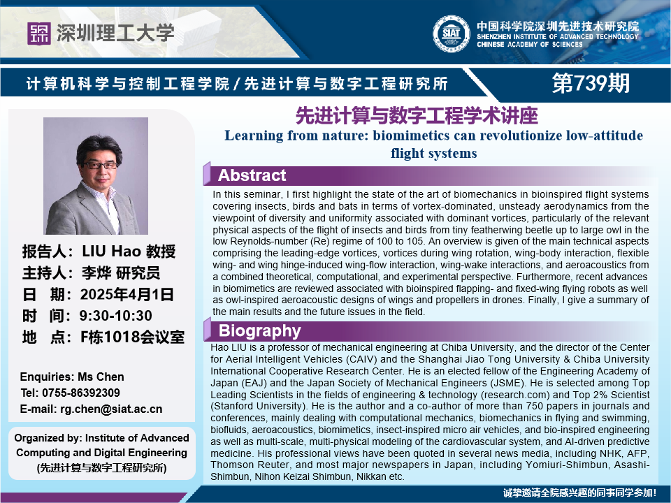数字所/计算机学院739学术讲座将于4月1日9:30-10:30在F1018会议室举行,本次讲座将邀请日本千叶大学 LIU Hao 教授作题为“Learning from nature: biomimetics can revolutionize low-attitude flight systems 的报告。