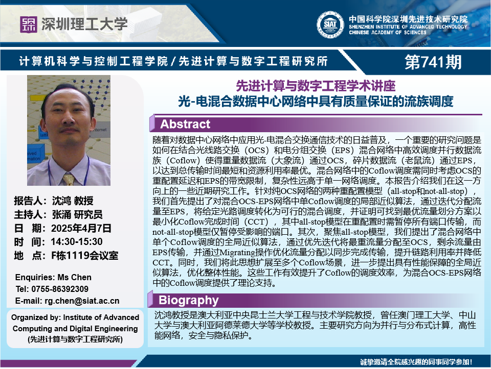 大家好!数字所/计算机学院第741期学术讲座将于4月7日14:30-15:30在F1119会议室举行,本次讲座将邀请澳大利亚中央昆士兰大学 沈鸿 教授作题为“光-电混合数据中心网络中具有质量保证的流族调度”的报告。本次报告将由数字所 张涌 研究员主持,诚挚邀请大家参加、学习和研讨!