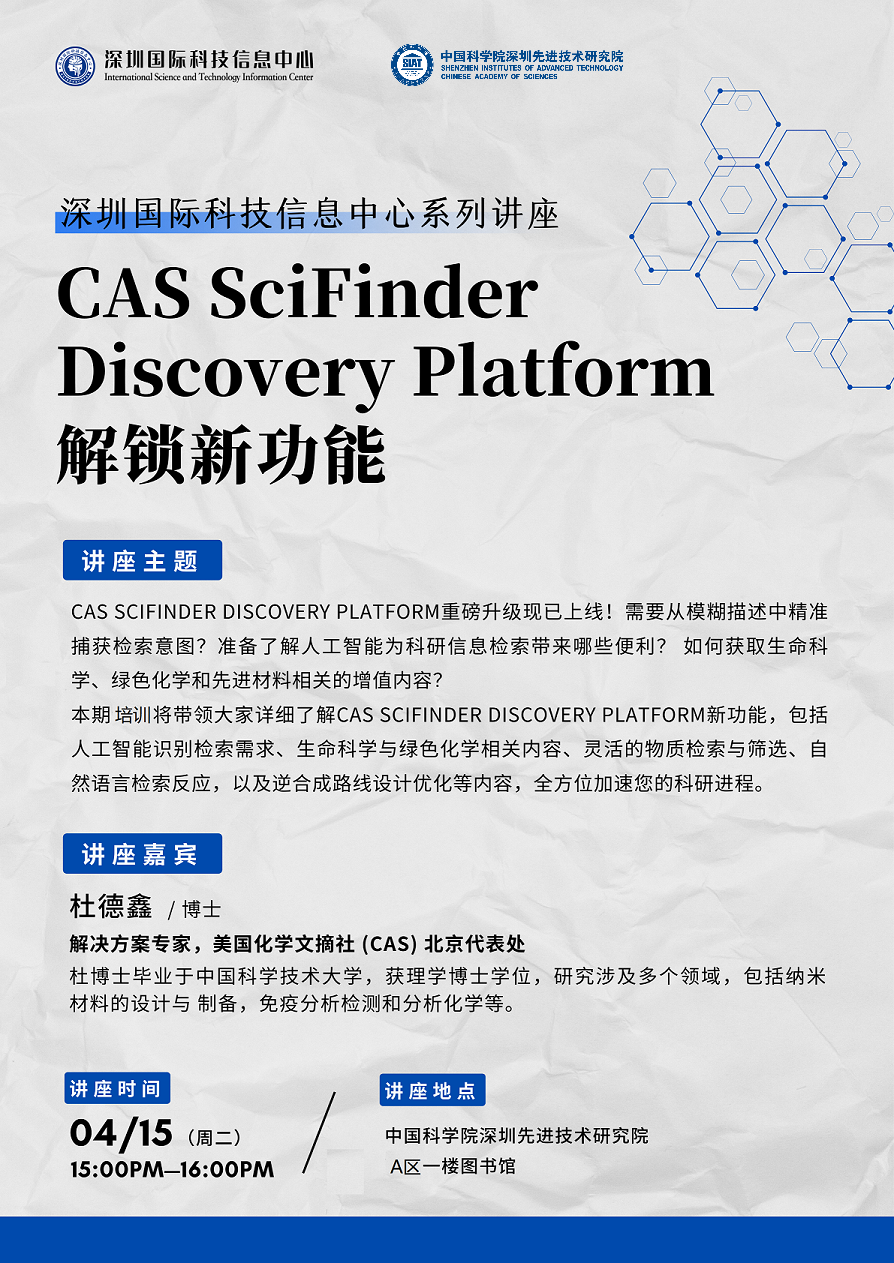 图书馆于 4月15日 (下周二) 15:00-16:00 邀请了来自美国化学文摘社 (CAS) 北京代表处的 杜德鑫 博士 带来“ CAS SciFinder Discovery Platform 解锁新功能培训讲座