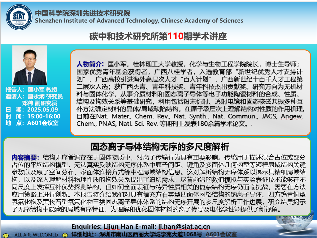 碳中和技术研究所第110期学术讲座将于05月09日(周五) 15:00-16:00在A601报告厅召开。本次讲座特邀桂林理工大学匡小军教授作题为《固态离子导体结构无序的多尺度解析》的学术报告。