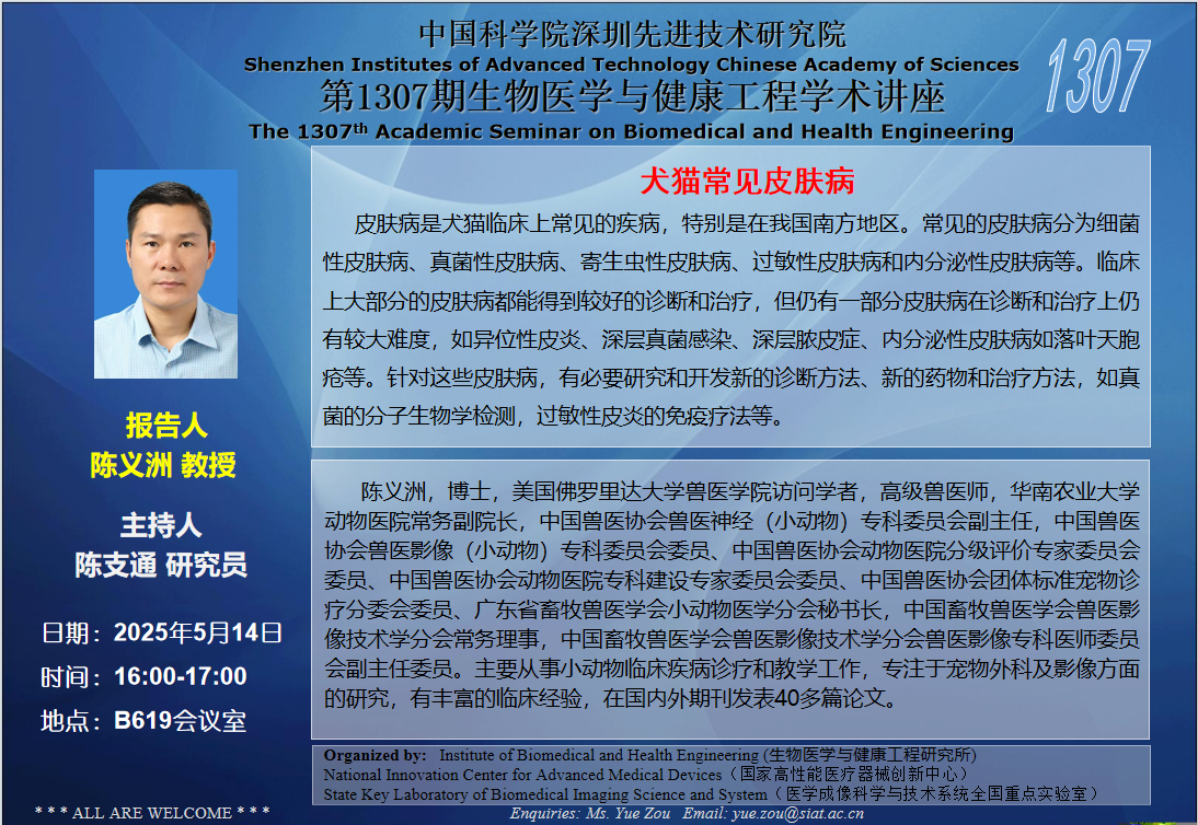 医工所第1307期学术讲座将于 2025年5月14日(周三) 16:00-17:00 B619会议室举行