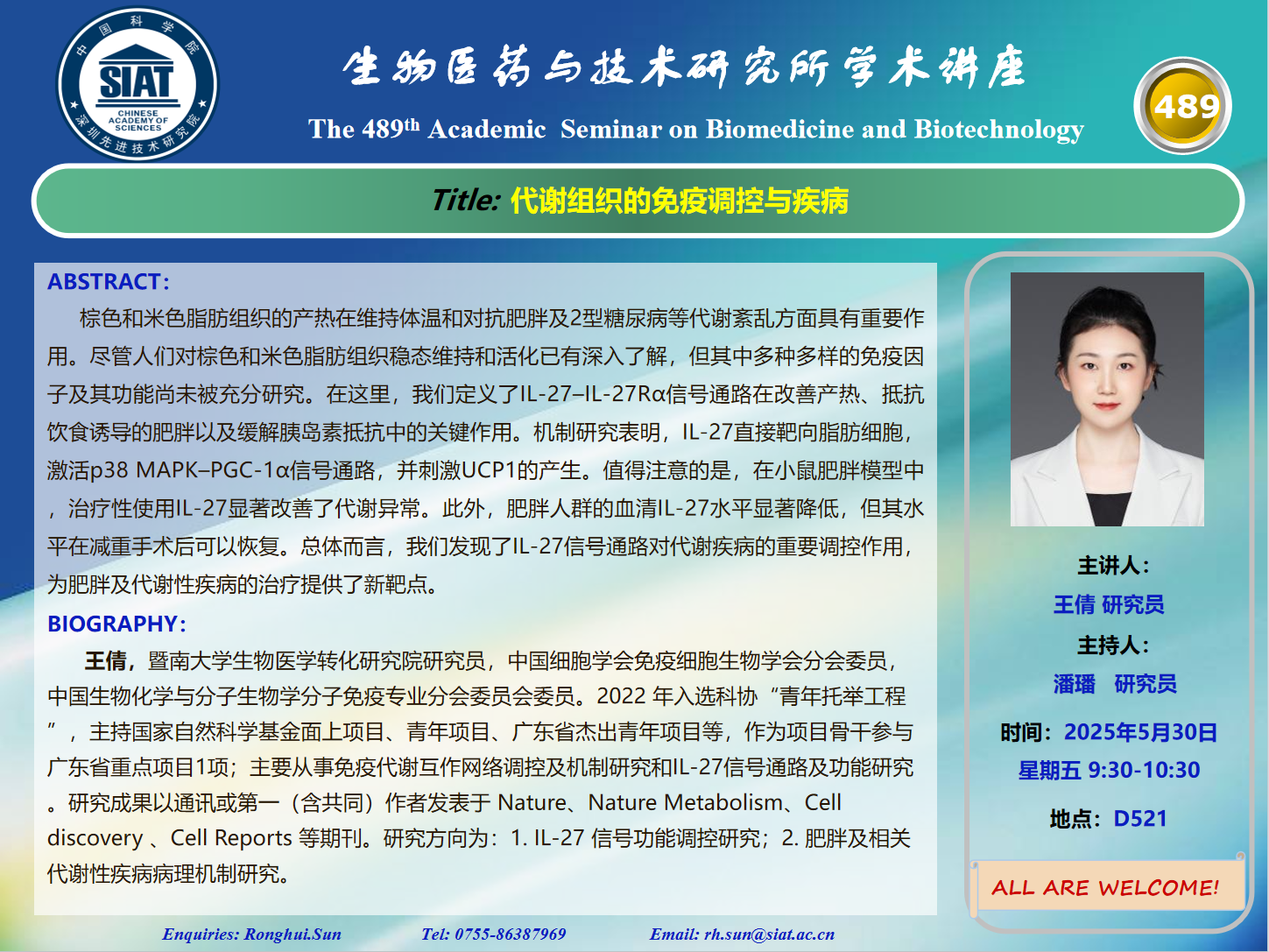 大家好! 医药所第489期学术讲座将于2025年5月30日 星期五 9:30-10:30 D521会议室举行。本次讲座邀请了来自暨南大学 王倩 研究员带来“代谢组织的免疫调控与疾病的报告。届时,潘璠   研究员将主持讲座。
