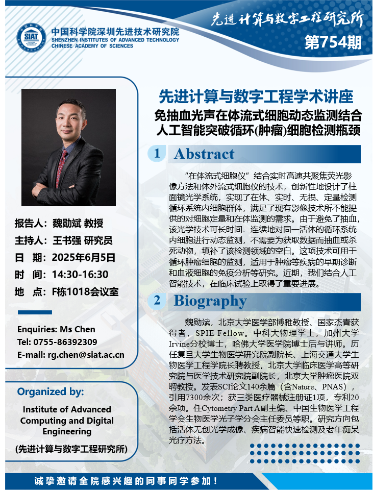 大家好!数字所/计算机学院754学术讲座将于6月5日14:30-16:30在F1018会议室举行,本次讲座将邀请北京大学医学部 魏勋斌 教授作题为“免抽血光声在体流式细胞动态监测结合人工智能突破循环(肿瘤)细胞检测瓶颈的报告。本次报告将由数字所 王书强 研究员主持, 诚挚邀请大家参加、学习和研讨!