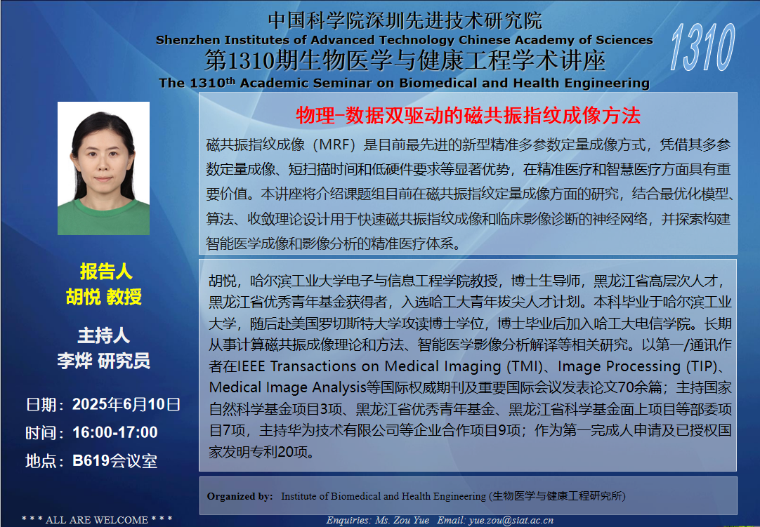 本次讲座邀请了哈尔滨工业大学电子与信息工程学院教授胡悦 教授带来题为“物理-数据双驱动的磁共振指纹成像方法的报告