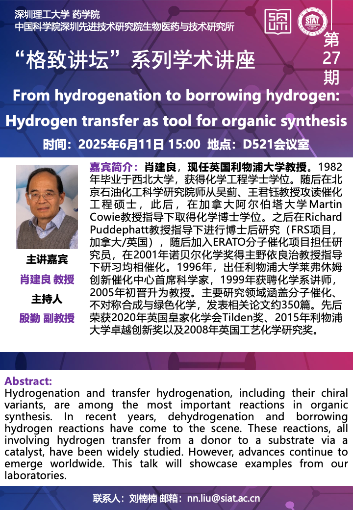 大家好!药学院/医药所“格致讲坛”系列学术讲座第27期将于2025年611日(周15:00,在先进院D521会议室举行。本次讲座邀请了来自英国利物浦大学肖建良 教授带来题为“From hydrogenation to borrowing hydrogen: Hydrogen transfer as tool for organic synthesis”的报告。届时,殷勤 副教授将主持讲座。