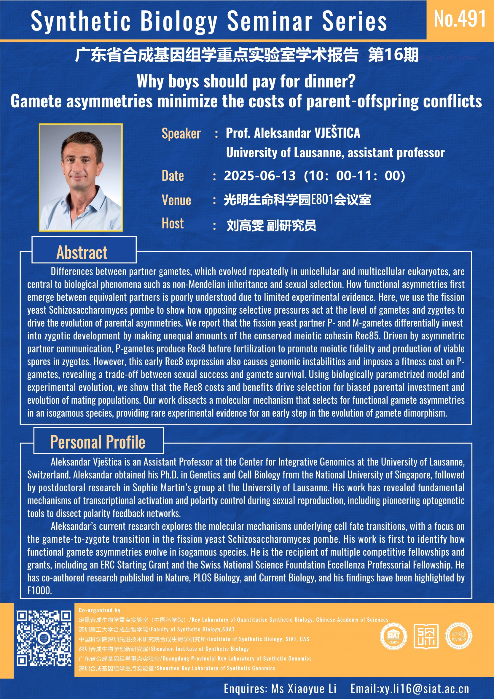本次讲座邀请了 University of Lausanne, assistant professor. Aleksandar VJESTICA带来题为 “Why boys should pay for dinner?  Gamete asymmetries minimize the costs of parent-offspring conflicts  ” 的报告。