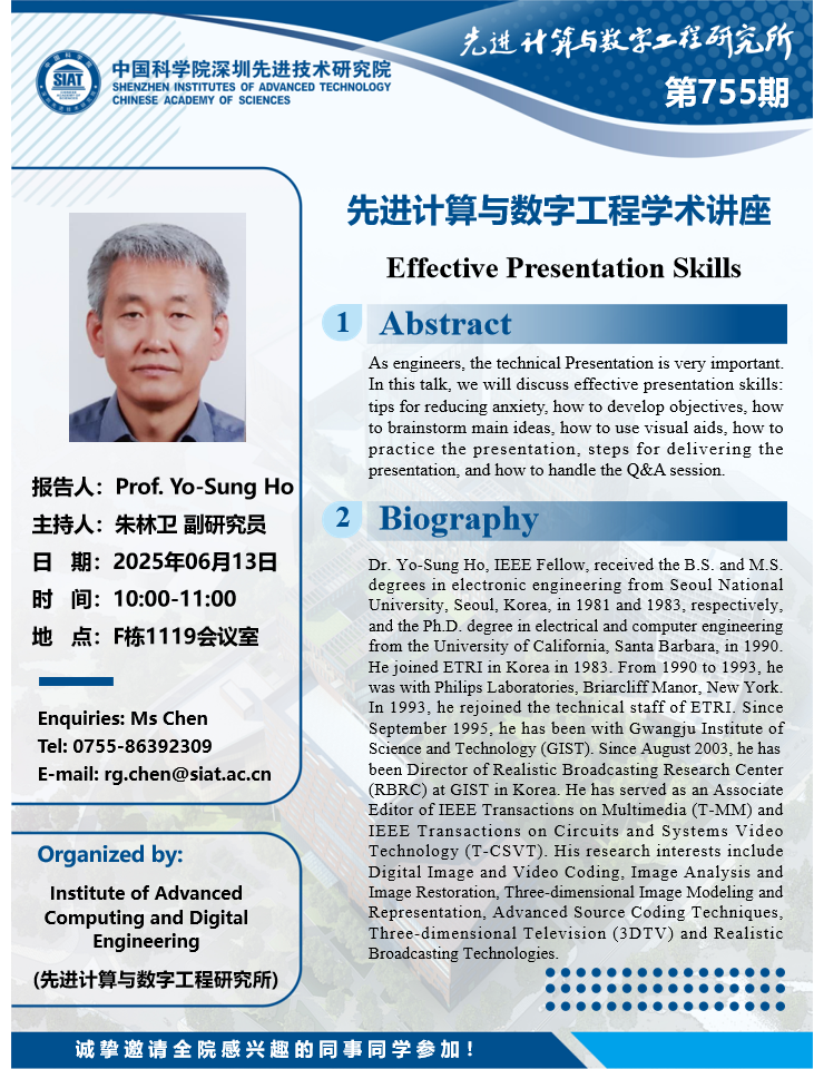 大家好!数字所/计算机学院第755期学术讲座将于6月13日10:00-11:00F1119会议室举行,本次讲座将邀请韩国光州科技学院 Yo-Sung Ho 教授作题为“Effective Presentation Skills”的报告。本次报告将由数字所 朱林卫 副研究员主持,诚挚邀请大家参加、学习和研讨!