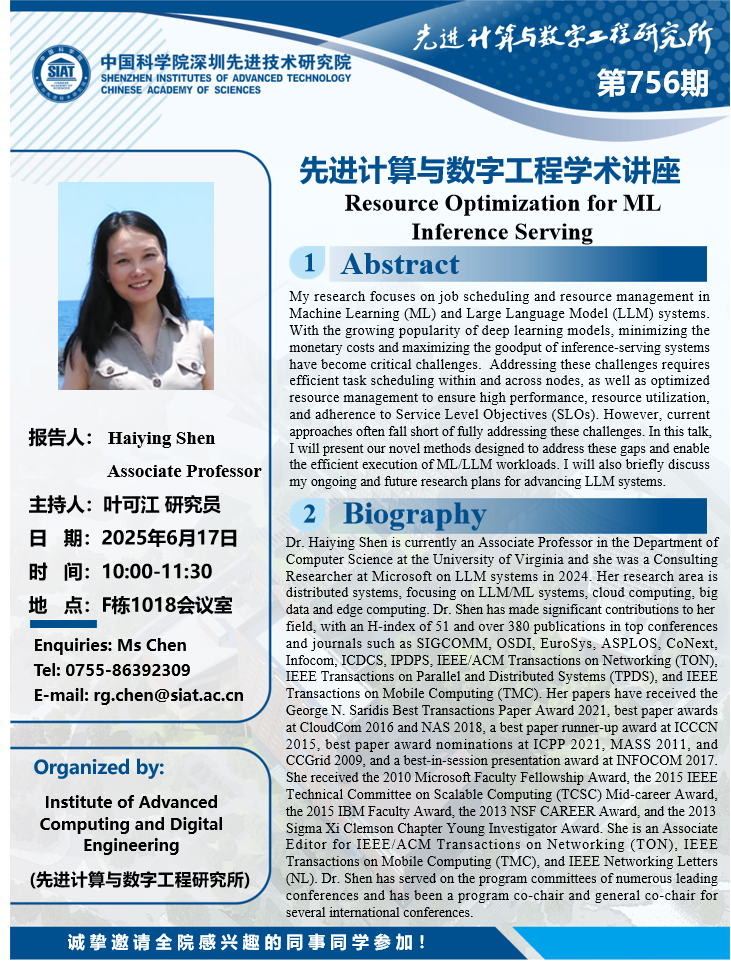 大家好!数字所/计算机学院756学术讲座将于6月17日10:00-11:30在F1018会议室举行,本次讲座将邀请弗吉尼亚大学(University of Virginia)Haiying Shen 副教授作题为“Resource Optimization for ML Inference Serving的报告。