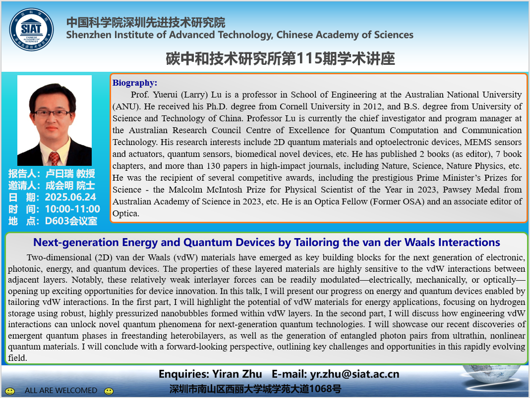 碳中和技术研究所第115期学术讲座将于6月24日(周二)10:00-11:00D603会议室召开。本次讲座特邀澳大利亚国立大学的卢曰瑞 教授作题为《Next-generation Energy and Quantum Devices by Tailoring the van der Waals Interactions》的学术报告。