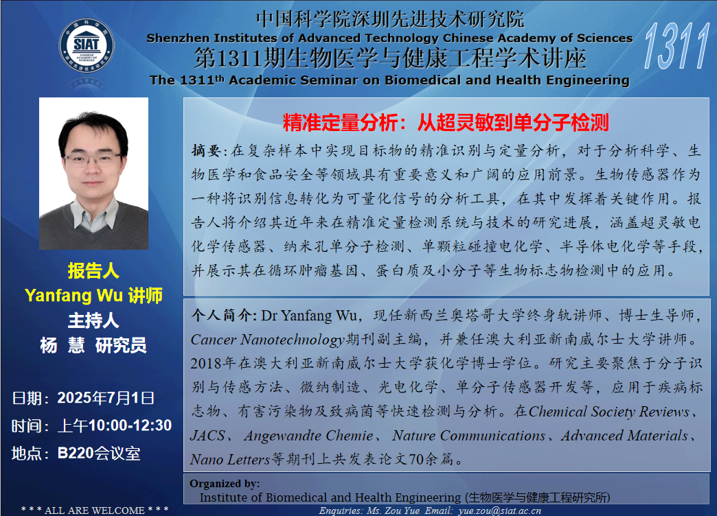 医工所第1311期学术讲座将于 2025年7月1日(周二) 10:00-12:30 B220会议室举行