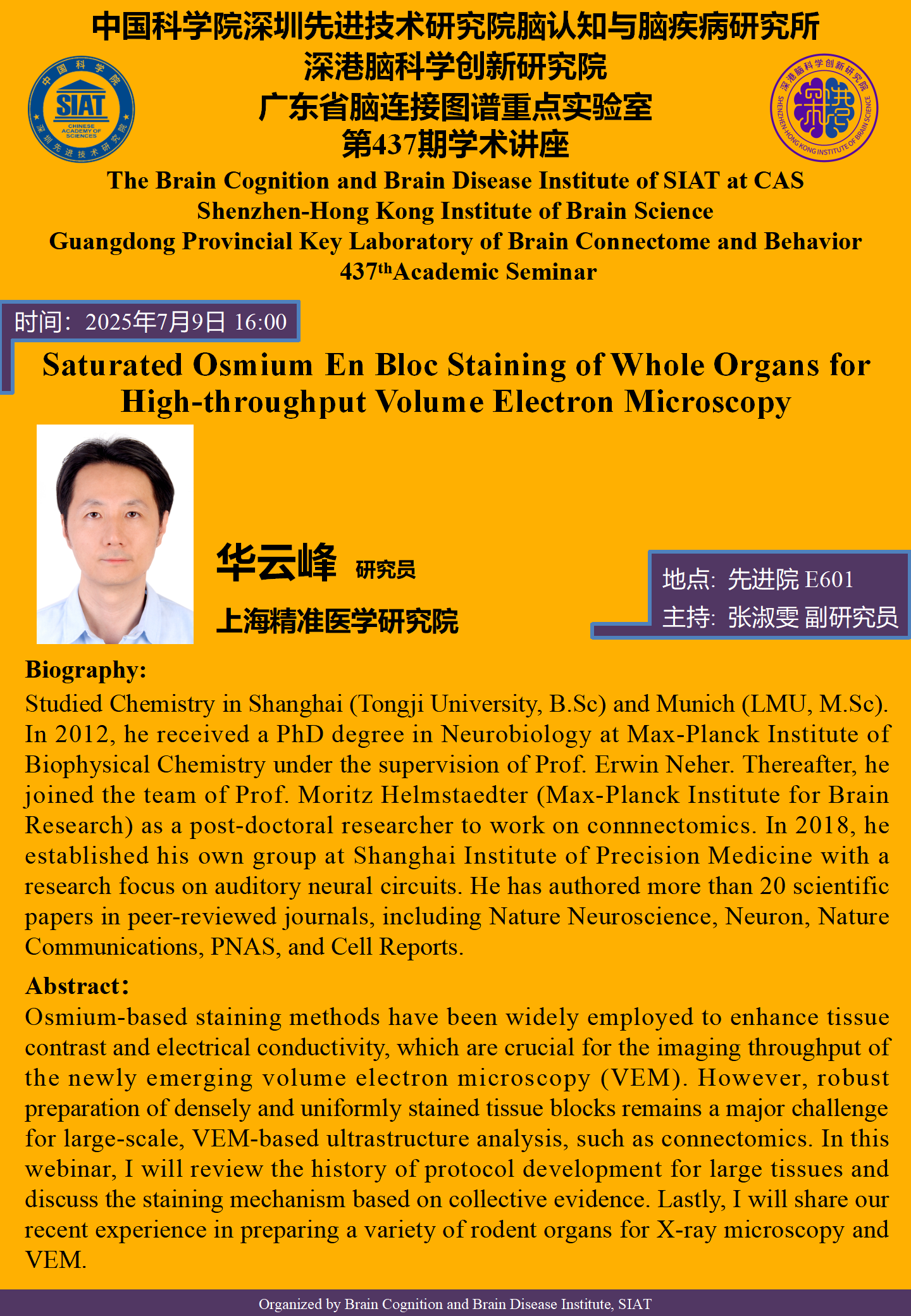 大家好!脑所/深港脑院将于7月9日(星期三) 16:00,举办第437期学术讲座。本次讲座邀请到上海精准医学研究院 华云峰 研究员,带来题为“Saturated Osmium En Bloc Staining of Whole Organs for High-throughput Volume Electron Microscopy的报告
