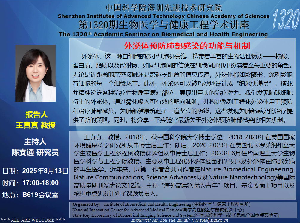 医工所第1320期学术讲座将于 2025年8月13日(周三) 17:00-18:00 B619会议室举行